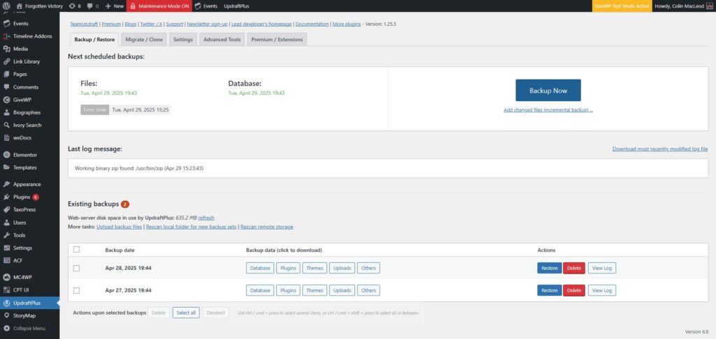 Via UpdraftPlus Backups > Settings, the site is current configured to make a full backup – files and database – every day, and to preserve the most recent two backups.