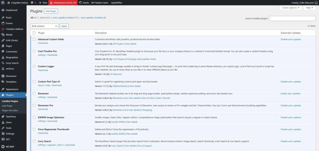 The one automatically updatable plugin that is not set to update automatically is Elementor. Elementor is critical to the site’s appearance and functionality.