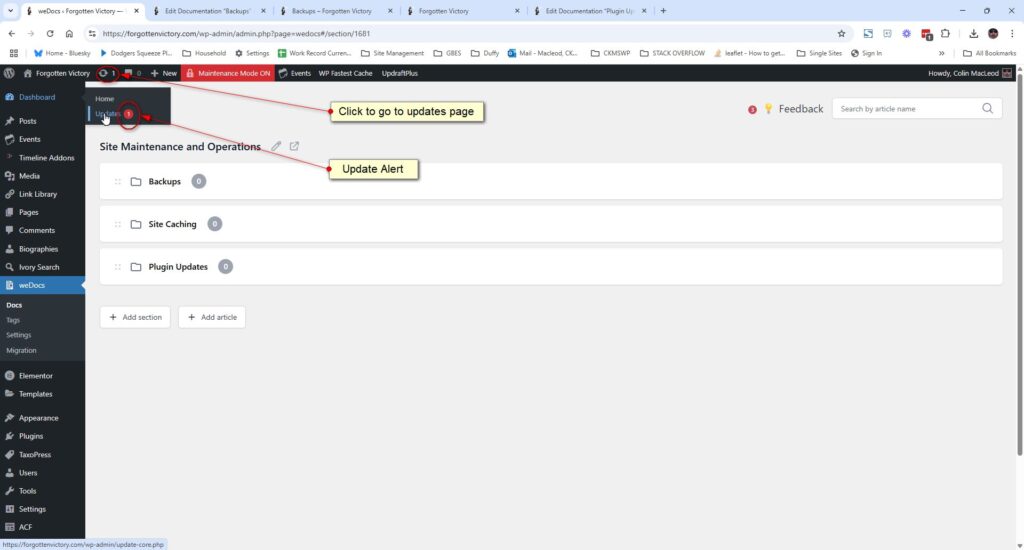 When Elementor or another part of the site is due for an update, and is either not set for automatic updates or has not yet been automatically updated, the interface will signal you. In the Admin bar, a refresh icon with a number (number of available updates) will appear. In the menu for the particular updatable item, an alert-type number icon will appear. Click on the signal or alert link, and you’ll be taken to the updates page.